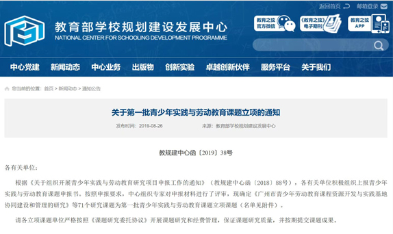 根据《关于组织开展青少年实践与劳动教育研究项目申报工作的通知》(教规建中心函〔2018〕88号),各有关单位积极组织上报青少年实践与劳动教育课题申报书。按照申报要求,中心组织专家对申报材料进行了评审,现确定《广州市青少年劳动教育课程资源开发与实践基地协同建设和管理的研究》等71个研究课题为第一批青少年实践与劳动教育课题立项课题(名单见附件)。